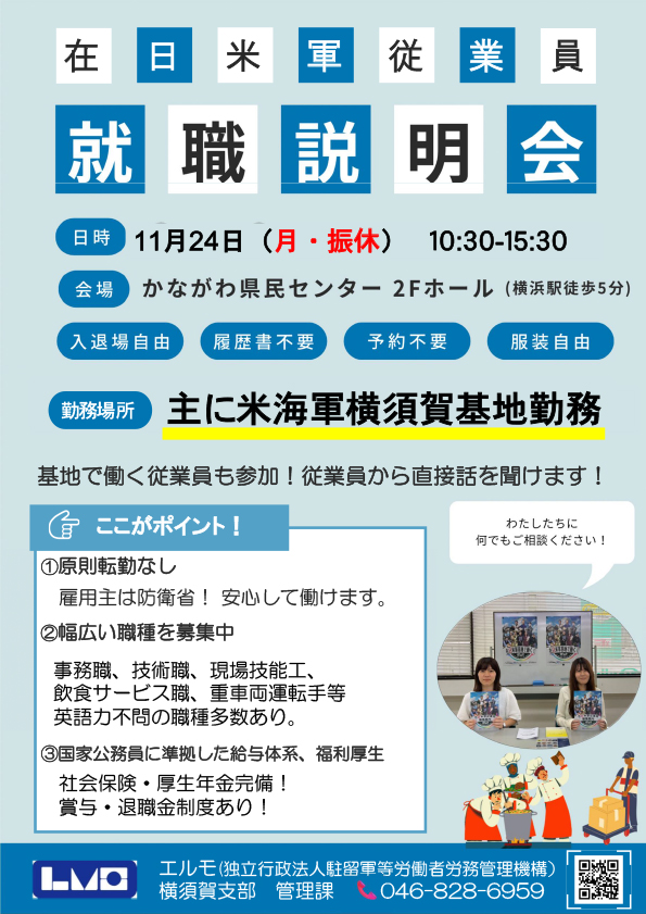 下記のとおり在日米軍従業員就職説明会を開催いたしますので、お知らせします。