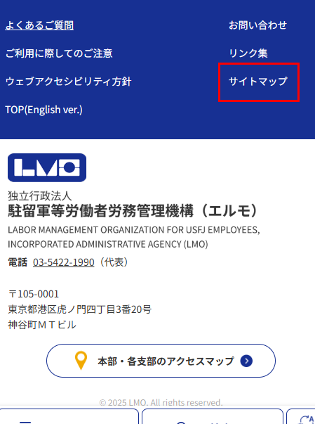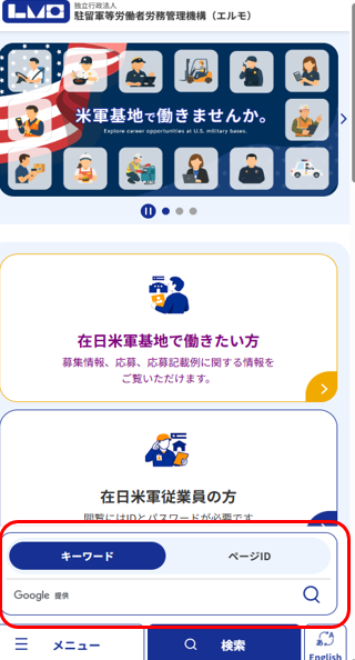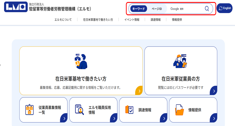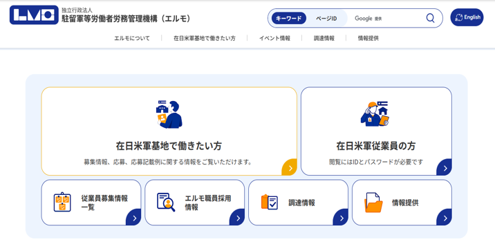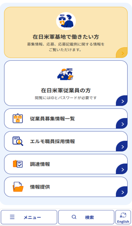 当サイトの情報は、「在日米軍基地で働きたい方」、「在日米軍従業員の方」、「エルモ職員採用情報」、「調達情報」、「情報提供」に分類し、提供しています。